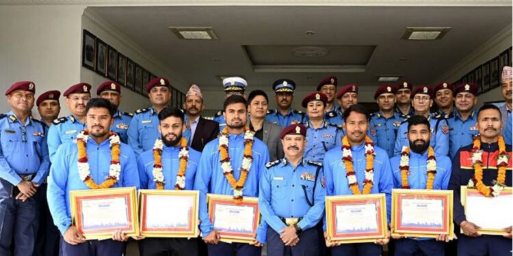 काठमान्डौ/नेपाल प्रहरीले ६ जना क्रिकेट खेलाडीहरूलाई सम्मान गरेको छ। राष्ट्रिय क्रिकेट टिमको प्रतिनिधित्व गरी हालै सम्पन्न एसिसी प्रिमियर कप-२०२३ लगायत विभिन्न अन्तर्राष्ट्रिय क्रिकेट प्रतियोगिताहरूमा उत्कृष्ट खेल प्रदर्शन गरेको भन्दै सम्मान गरिएको हो ।