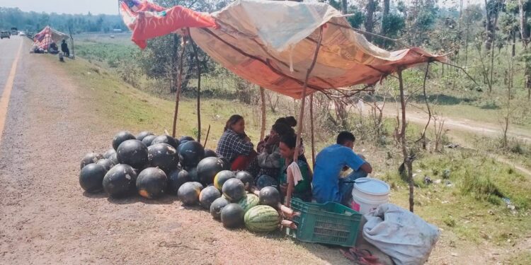 काठमान्डौ/महेन्द्र राजमार्ग छेउमै लहरै छन्, स–साना छाप्रा । अघिल्तिर भरिभराउ तरभुजा । किनमेल गर्नेको त्यस्तै भीडभाड । झट्ट हेर्दा राजमार्गमा ‘तरभुजा मेला’ लागेजस्तै देखिन्छ ।