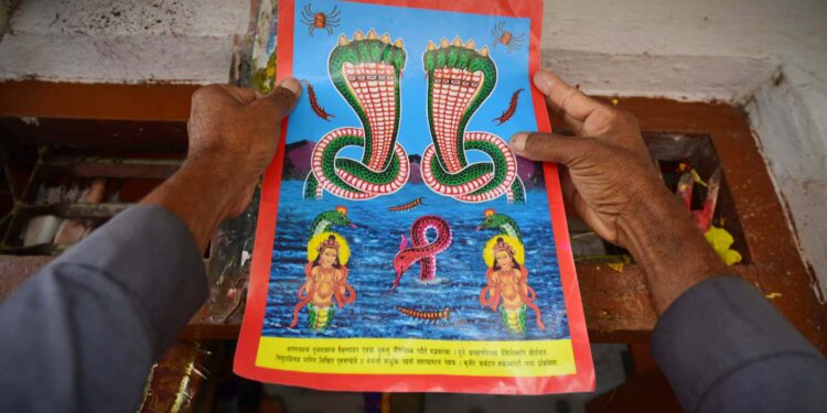 काठमान्डौ/प्रत्येक वर्ष श्रावण शुक्ल पञ्चमीका दिन मनाइने नागपञ्चमी पर्व आज घरका मूल ढोकामाथि ब्राह्मण पुरोहितबाट नागको तस्वीर टाँसी पूजाआराधना गरेर मनाइँदैछ ।