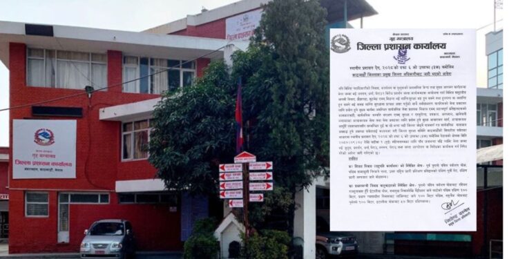 स्थानीय प्रशासन ऐन, २०२८ को दफा ६ को उपदफा ३ (क) बमोजिम जिल्ला प्रशासन कार्यालय काठमाडौंले पाँच वटा क्षेत्रलाई आगामी दुई महिनासम्मका लागि निषेधित क्षेत्र तोकिएको प्रमुख जिल्ला अधिकारी जीतेन्द्र बस्नेतले जानकारी दिए ।